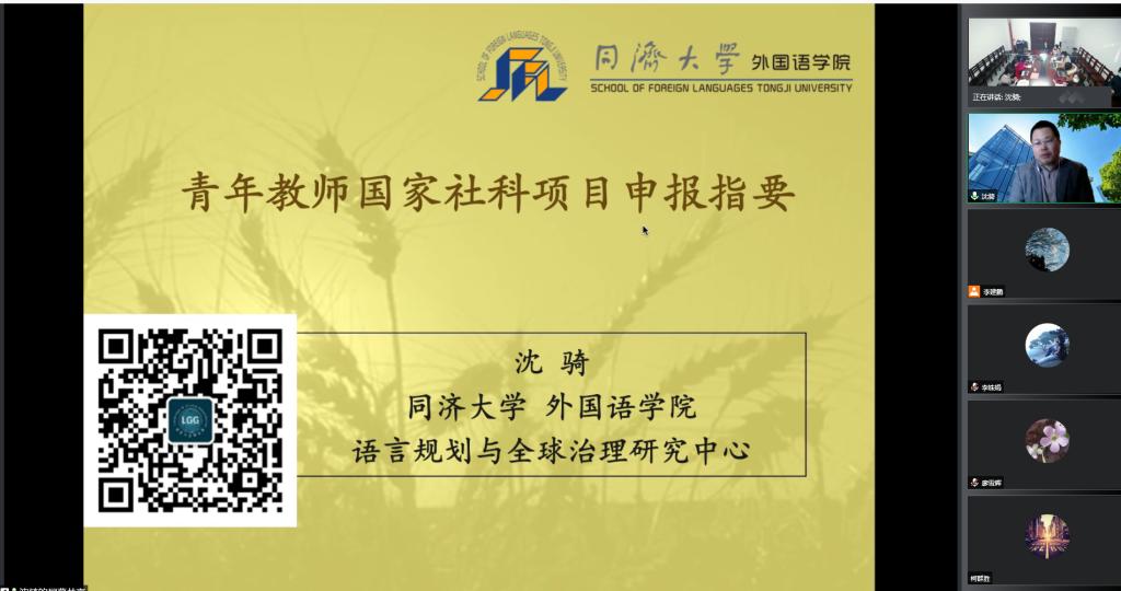 1月15日,同济大学博士生导师沈骑教授受外国语学院之邀,在云端作了题为“青年教师国家社科项目申报指要”的学术讲座。讲座由副院长柯群胜主持,外国语学院青年教师在04-313会议室,其他教师在线上聆听了此次讲座。