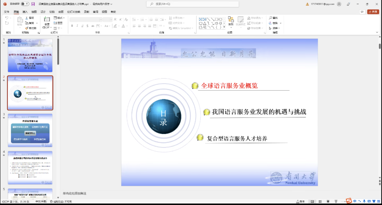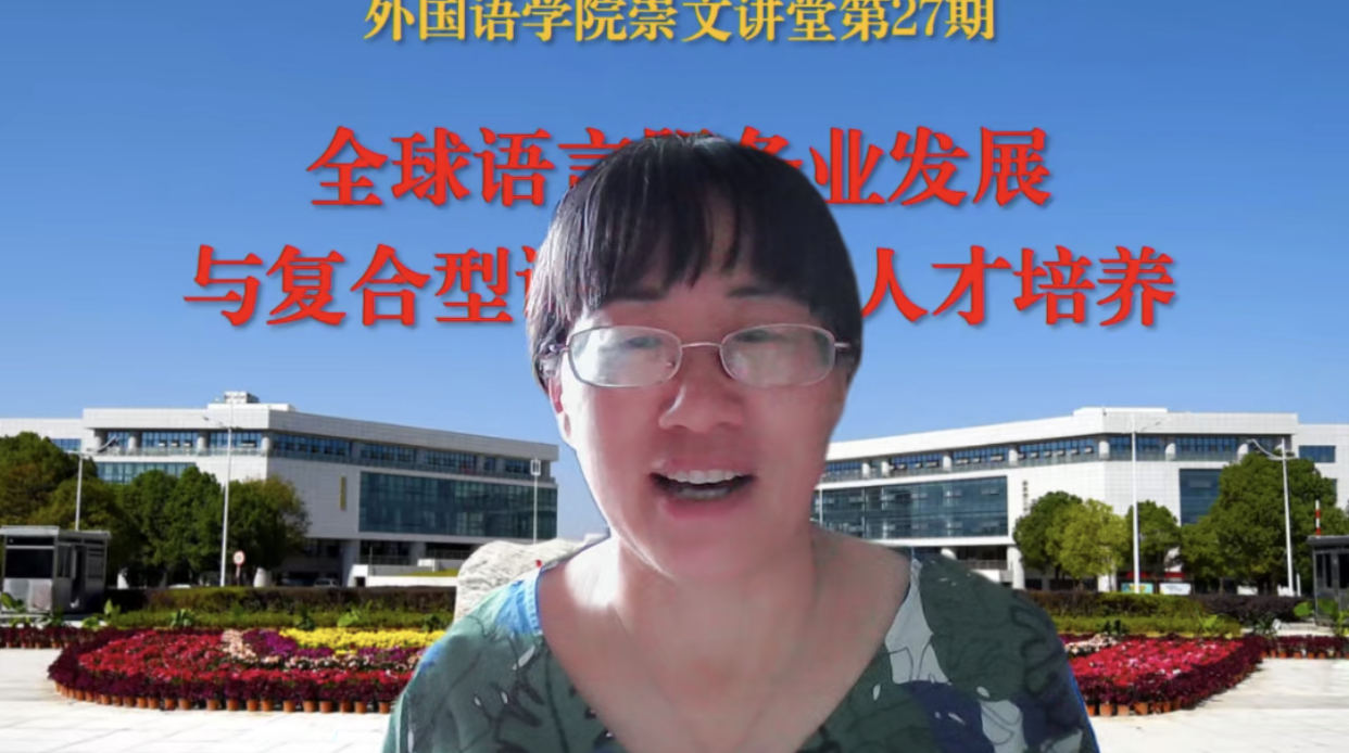 正值暑假,7月20日上午9点,南开大学外国语学院博士生导师王传英教授应外国语学院之邀,在云端作了题为“全球语言服务业发展与复合型语言服务人才培养”的学术讲座。讲座由院长谭燕保教授主持,外国语学院全体教师及MTI中心研究生在线参加了此次讲座。
