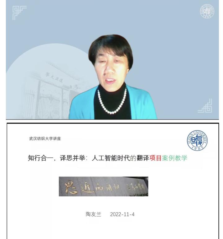 11月4日晚7:30,外国语学院邀请复旦大学翻译系主任、MTI教育中心主任、博士生导师陶友兰教授在云端为全体教师做了一场精彩的学术讲座,题目为:知行合一,译思并举:人工智能时代的翻译项目案例教学。讲座由院长谭燕保教授主持。