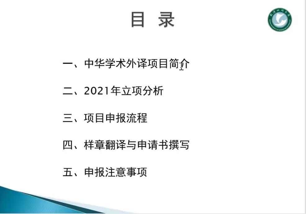2023年国家社科基金申报工作已经拉开了帷幕。为做好中华学术外译项目的申报动员工作,12月23日晚7点,外国语学院邀请到了武汉科技大学外国语学院副院长李金云教授在云端做了题为“国家社科中华学术外译项目的选题与申报”的学术讲座,讲座由学院刘方荣副院长主持,全体教师及MTI部分研究生在线上聆听了此次讲座。