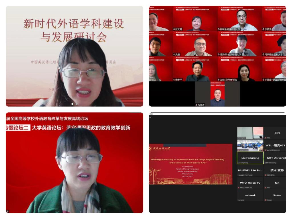 六、应邀参加国际、国内学术交流并做主旨报告或主旨发言10人次,学院教师学术影响力得到新彰显。3月,谭燕保在第六届全国高等学校外语教育改革与发展高端论坛做“英语教育中的国家意识和国际视野”主题报告;6月,谭燕保在新时代外语学科建设与发展研讨会做“社会服务的武汉纺织大学方案”专题报告;11月,谭燕保在第五届外语学科发展论坛暨新时代外语人才培养全国研讨会做“英语专业人才培养的整体性思维”主题报告;10月,刘方荣、吴志杰在2022国际语言教学跨学科会议分别做主旨报告;12月,陈芬在新世纪中国比较文学与世界文学发展新趋势研讨会做主旨发言。此外,积极推进各类虚拟教研室、学术共同体活动,其中与南开大学合作的 “赋权增能”虚拟教研室教研活动尤其活跃,教师在其公众号平台发稿8篇,很好地展示了我院专业特色及教师风采。