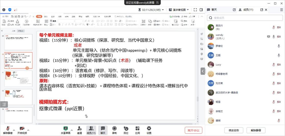 院长谭燕保教授首先回顾了过去一年外国语学院《理解当代中国》系列课程的开展与进展,让与会教师对“三进”工作、新文科建设、课程思政、在线课程等有了更深层次的了解,对后期的工作方向、课程建设目标有了更清晰的认识。基于老师们对《理解当代中国》系列课程的建设经验,尤其是《理解当代中国阅读与写作课程》的深刻认识与丰富教学体验,谭燕保教授谈了自己对本课程每一个主题的见解与上课思路,建议老师们可以透过教材文本从宏观到微观、从国家角度到全球角度去理解当代中国、历史中的中国、未来的中国。“作为教师,我们有了这种视野,这种思维和格局,立德树人、培养一流的外语人才、新时代的国际传播人才目标方可落到实处”,谭燕保教授对课程的后期建设提出了要求与希望。接着,课程团队教师结合自己过去一年的授课体验与经验,谈了后期在线课程建设的看法与建议。