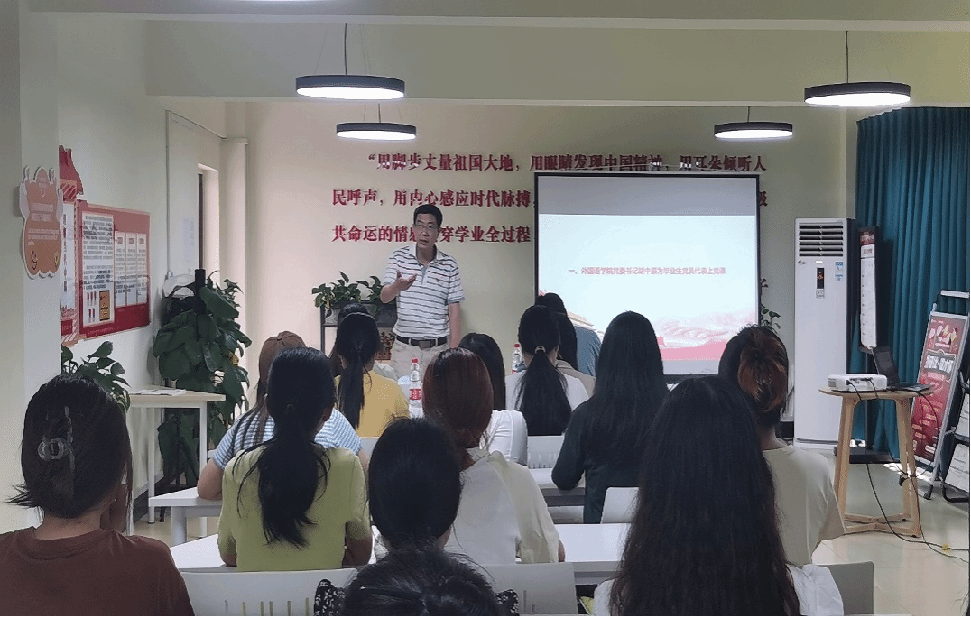 首先,外国语学院党委书记胡中原为毕业生党员代表讲授党课,他从两个方面开展此次党课培训。一方面,他为大家讲解学习主题教育的重要思路,指明“学思想、强党性、重实践、建新功”等关键词的重要内涵;另一方面,他指出,大学四年的人生光阴,是同学们一生中最值得纪念的,在此,有三句话送给毕业生:希望大家成为一个真正的大人,成为一个真正有文化的人,成为一个永远的纺大人。