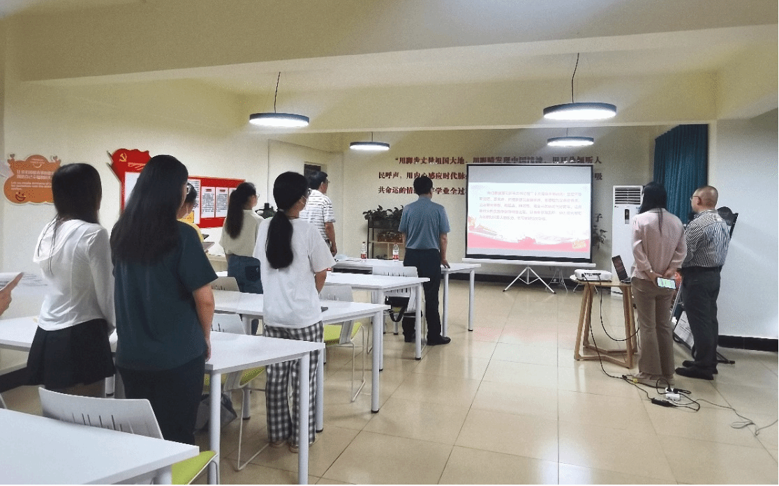 6月13日上午,在外国语学院读“习”有声学生成长服务站举行了导学思政·双语主题党日活动。外国语学院党委书记胡中原,党委副书记彭阳慈航,组织员张德智,研究生导师代表柯细香、辅导员和毕业生党员代表一同参加。