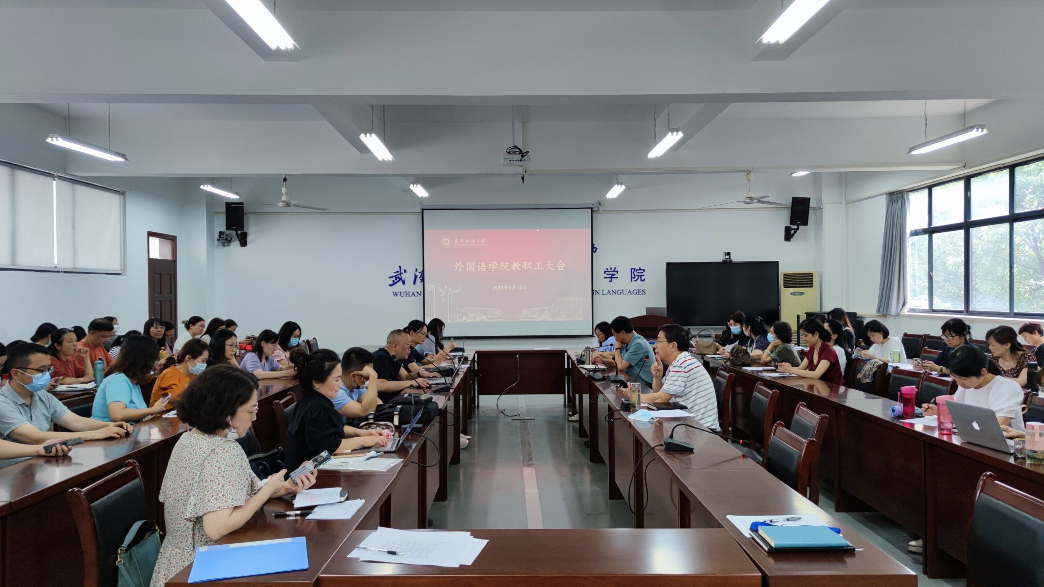 6月15日下午,外国语学院召开全体教职工大会,开展政治理论集中学习,学院党委书记胡中原主持会议,全体教职工参加会议。