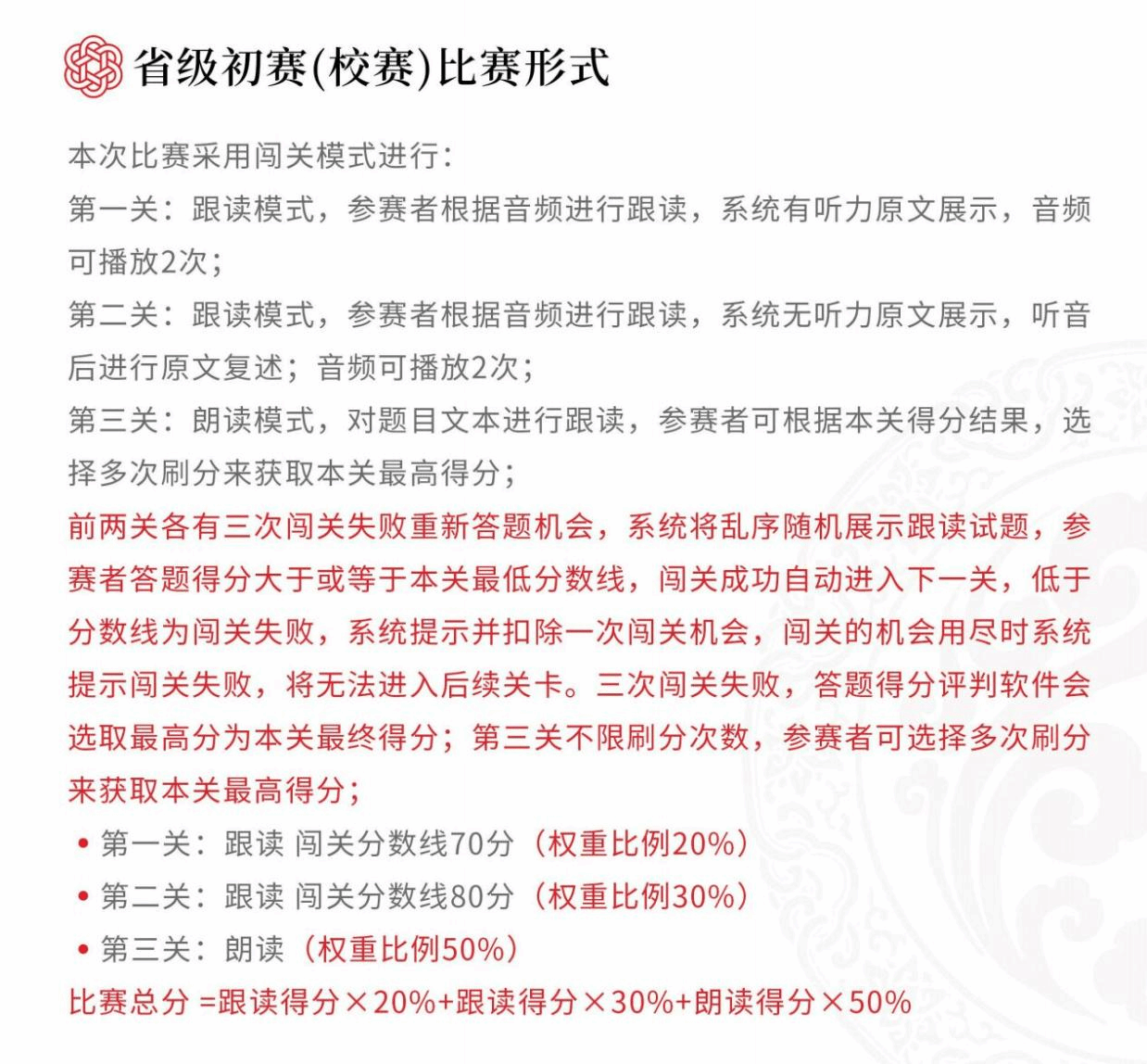 初赛采用线上的形式进行比赛,网络平台根据参赛选手的发音、语调、流利度、完整度四个维度自动生成的最终分数与排名进行评审,评分采用百分制。