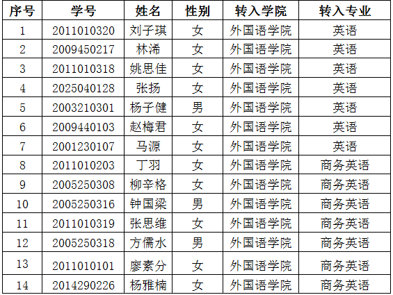 经过外国语学院的笔试、口试及面试,现决定根据成绩排名接受以下同学的转专业申请,特此公示。