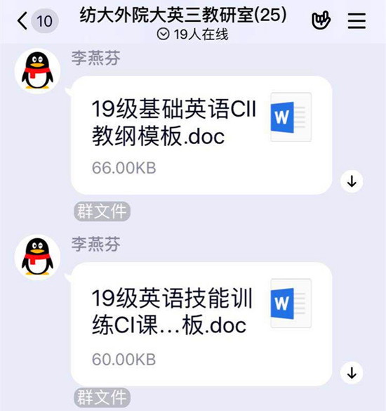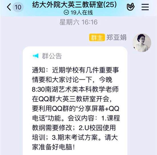 郑亚娟主任首先转达了学校教学督导关于课程教纲修改的具体要求,她强调,本学期课程教纲在“致学生话中”要反映线上、线下教学安排,鼓励学生进行线上学习并提出建议和要求。郑主任利用“QQ电话+分享屏幕”的方式对老师们进行了U校园使用培训,并组织了对《大学基础英语C IV》课程大纲的研讨与修改。