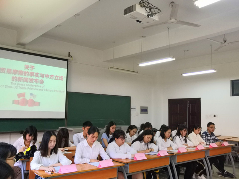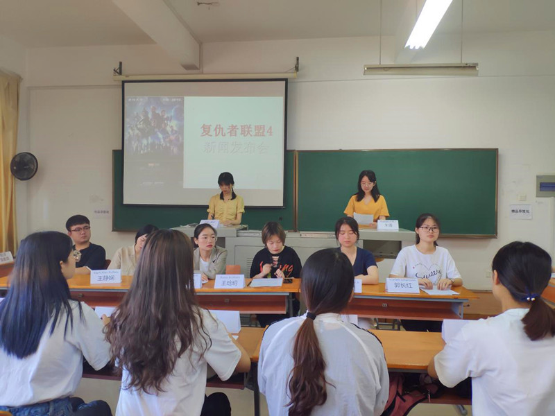 模拟新闻发布会内容紧扣时下热点,主题包括“中美贸易摩擦的事实与中方立场”、“复仇者联盟发布会”等,每一位学生都有机会上台承担口译员任务,从举止仪态、语音语调再到口译表达,学生们将日常口语训练技能课上理论知识充分运用到实践中。在模拟新闻发布会结束时,在曹老师的积极引导下,学生们就相互之间的口译表现情况进行打分,并分享交流各自的口译实践体会。