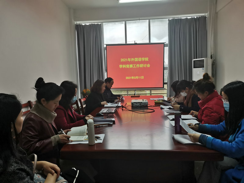 3月11日下午,外国语学院在崇文楼313会议室召开2021年学科竞赛工作研讨会,学院副院长罗绮伦,副书记王芳及各竞赛负责老师参加会议。