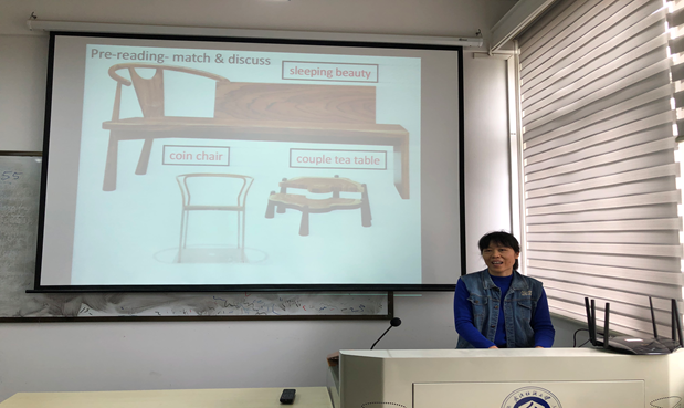 为使老师们对学科英语课程有更全面和深入的了解,学科英语课程团队的韦勤勤、周文静和邵嘉三位老师就其所教授的《艺术设计英语》为全体老师进行了精彩的课程展示与教学反思。课程负责人韦老师首先向大家简要介绍了该课程的课程目标、教学素材及整体教学情况,并就自己的教学实践与学生反馈进行了教学反思,指出语言教师参与学科专业知识的培训和学习是课程发展的必经之路。随后,韦老师结合自制课件形象生动地展示了如何基于产出导向,通过灵活多样的形式提升学生阅读、翻译、归纳与转述的能力。