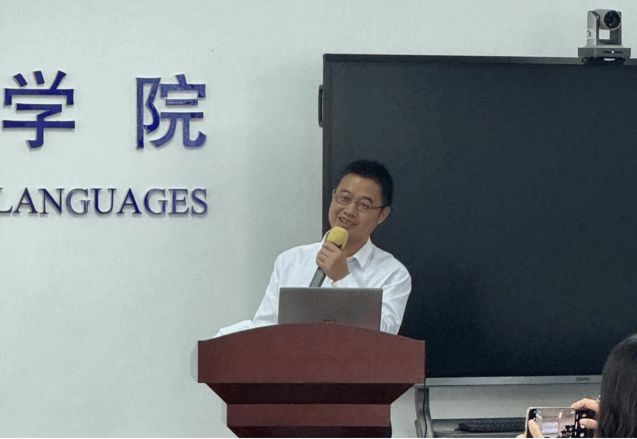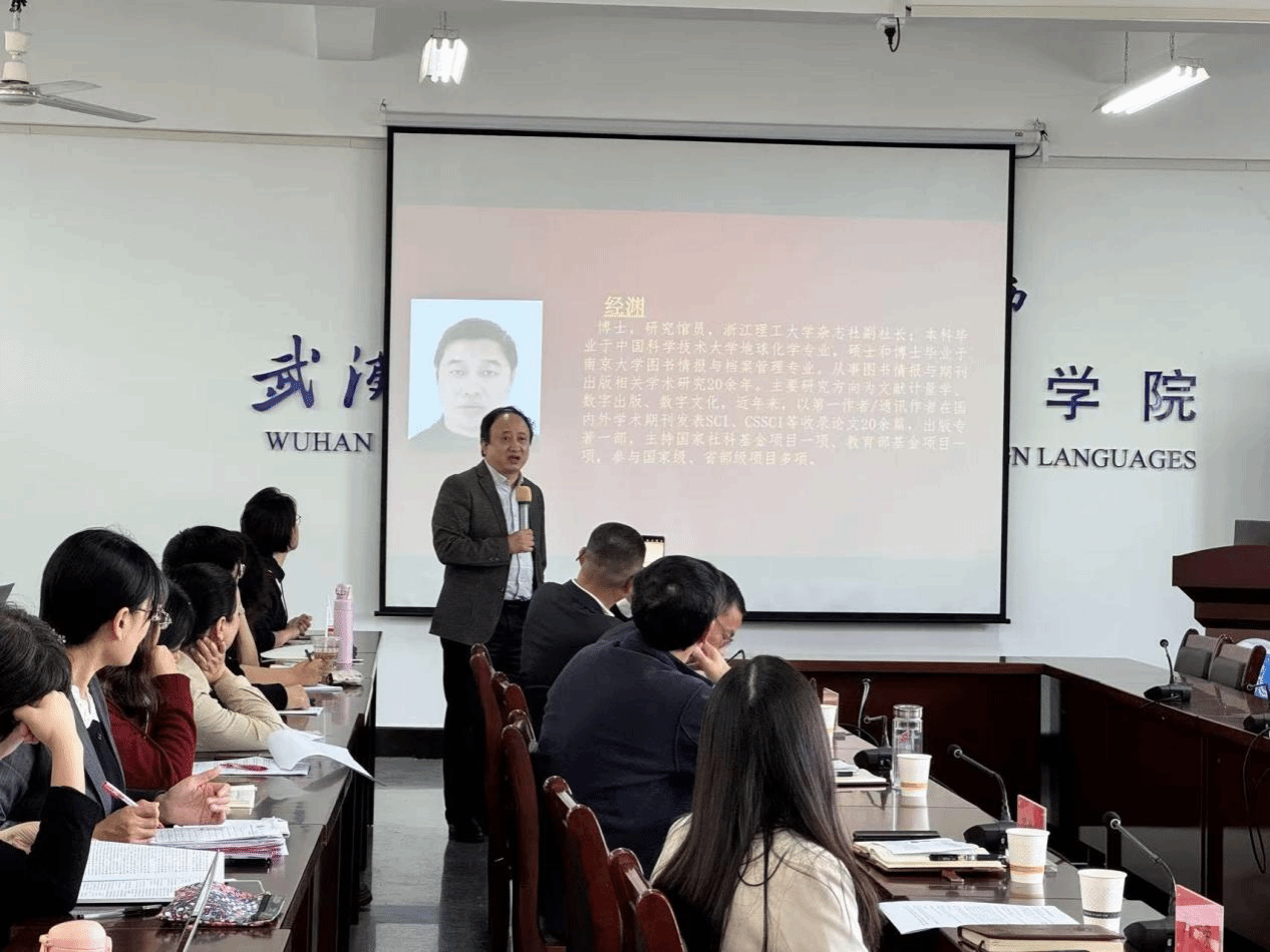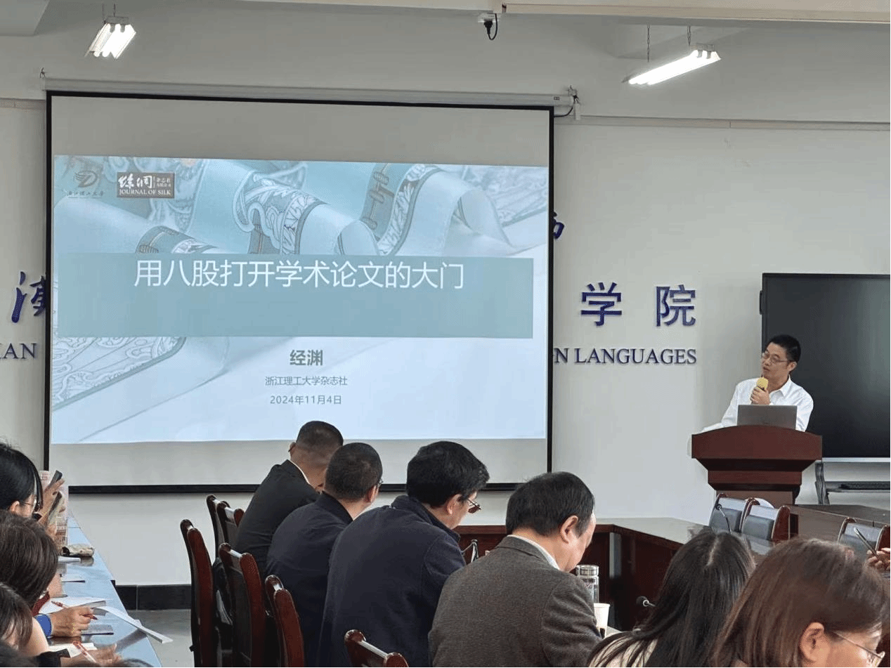 经渊在致辞中阐释了浙江理工大学杂志社的办社宗旨和理念,介绍了下属的四个期刊和一个年鉴的情况,并诚挚邀请外国语学院师生踊跃投稿,共同在学术的道路上开花结果。