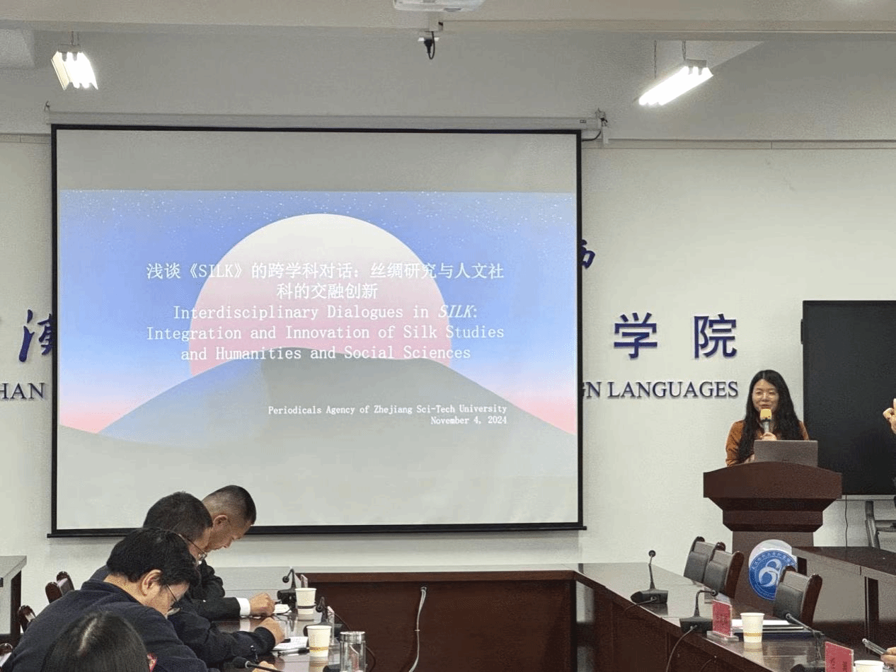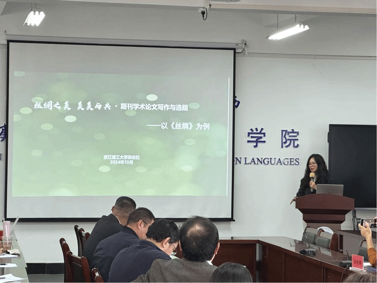 杨一舟的讲座题目是“丝绸之美 美美与共”期刊学术论文写作与选题—以《丝绸》为例。《丝绸》期刊由浙江理工大学、中国丝绸协会、中国纺织信息中心共同主办,是国际丝绸联盟、中国丝绸协会、浙江省纺织工程学会的会刊。该期刊连续多次被评为“中国高校优秀/百佳科技期刊”,并在2021年荣获中国出版政府奖期刊提名奖,2023年入选中国科学院CSCD数据库(核心库)、全国中文核心期刊、中国科技核心期刊。她介绍了《丝绸》的办刊理念:固化于制、外化于行、内化于心、实化于践。杨一舟表示,2025年,《丝绸》将聚焦数智时尚,打造学术高地,积极营造学术氛围,构建学科交叉融合平台,发表纺织领域基础研究、技术创新、设计理论和文化传承等方面的学术论文。