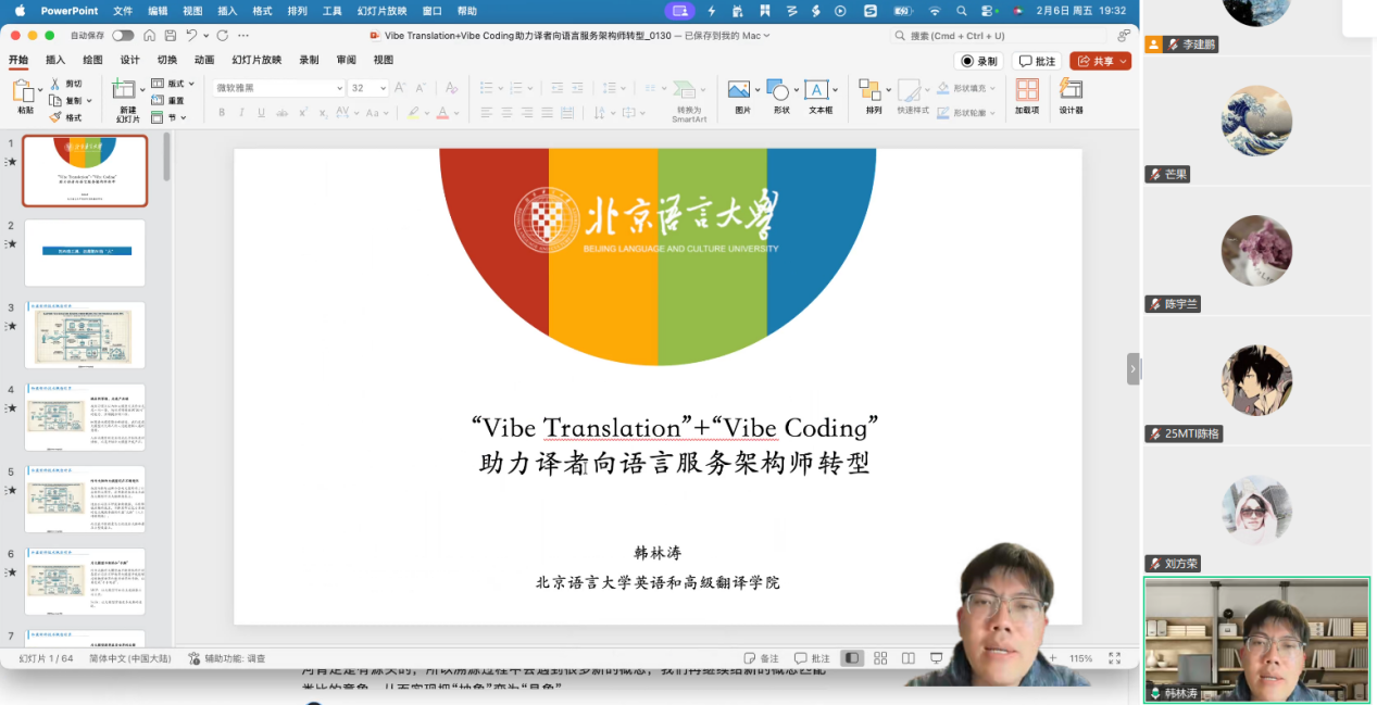 2月6日晚,外国语学院邀请北京语言大学英语和高级翻译学院副院长、硕士生导师韩林涛博士给学院师生举办了题为“Vibe Translation+Vibe Coding助力译者向语言服务架构师转型”的线上讲座。讲座由副院长刘方荣主持,学院部分教师和MTI学生在线参加。