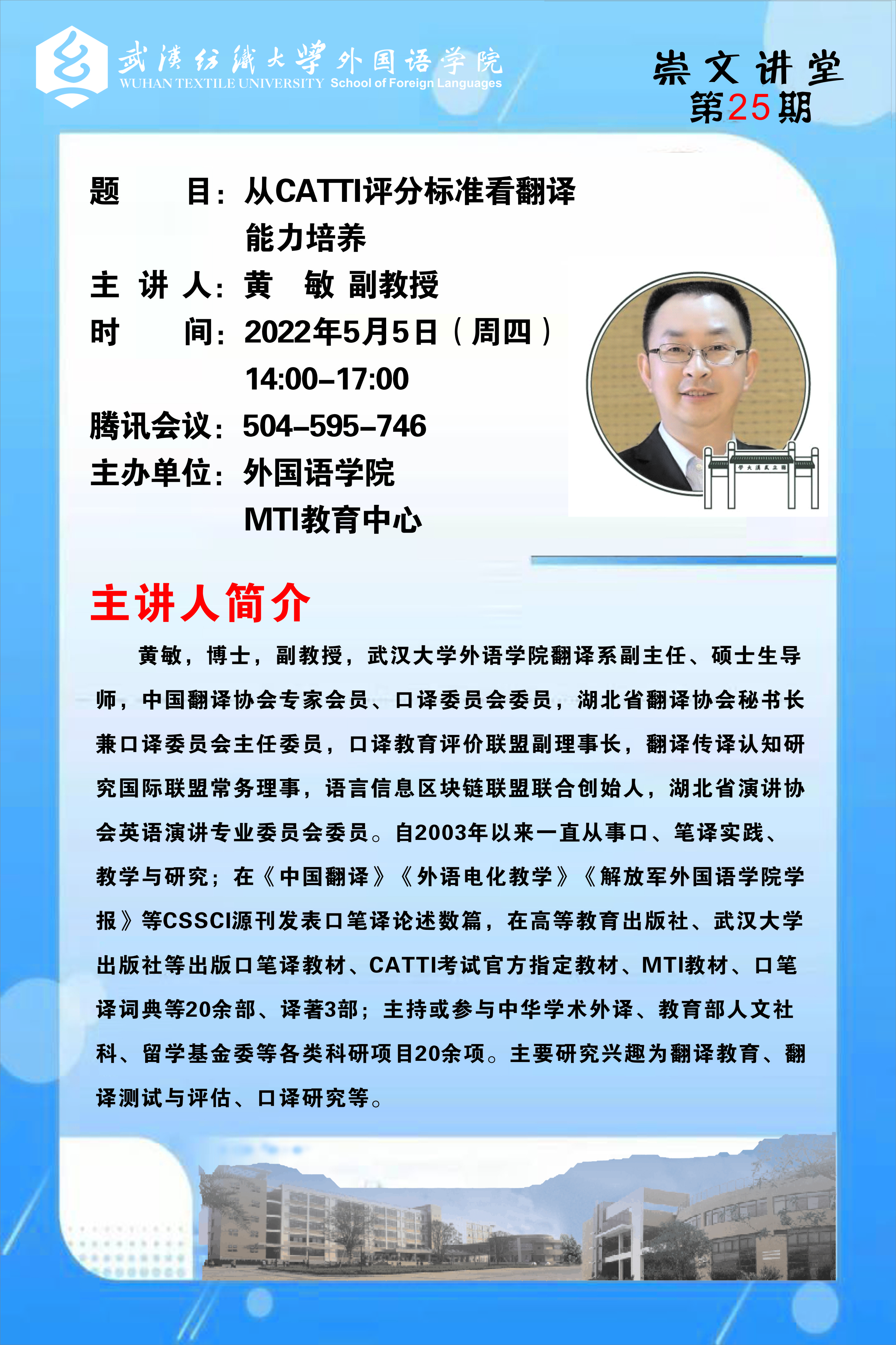【讲座改期通知】2022年“崇文讲堂”学术报告第25期:从CATTI评分标准看翻译能力培养