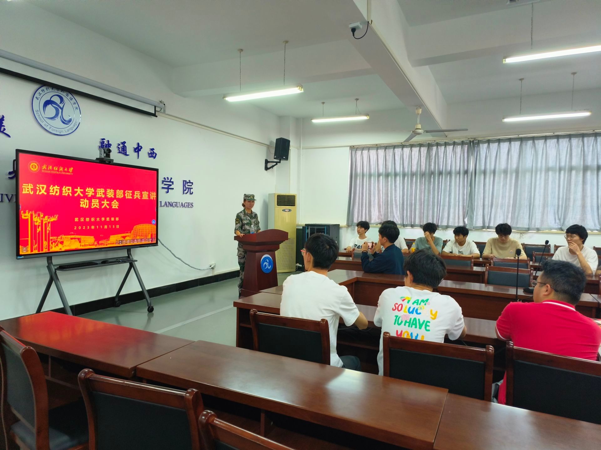 5月12日,外国语学院征兵宣传会在崇文楼303顺利举行。本次宣传会旨在向外国语学院学生介绍国防和军队建设的基本情况,激发大学生爱国热情,弘扬爱国主义精神,引导大学生树立正确的国防观念和军人荣誉感,积极响应党和政府的征兵号召,为国家安全和军队建设贡献力量。