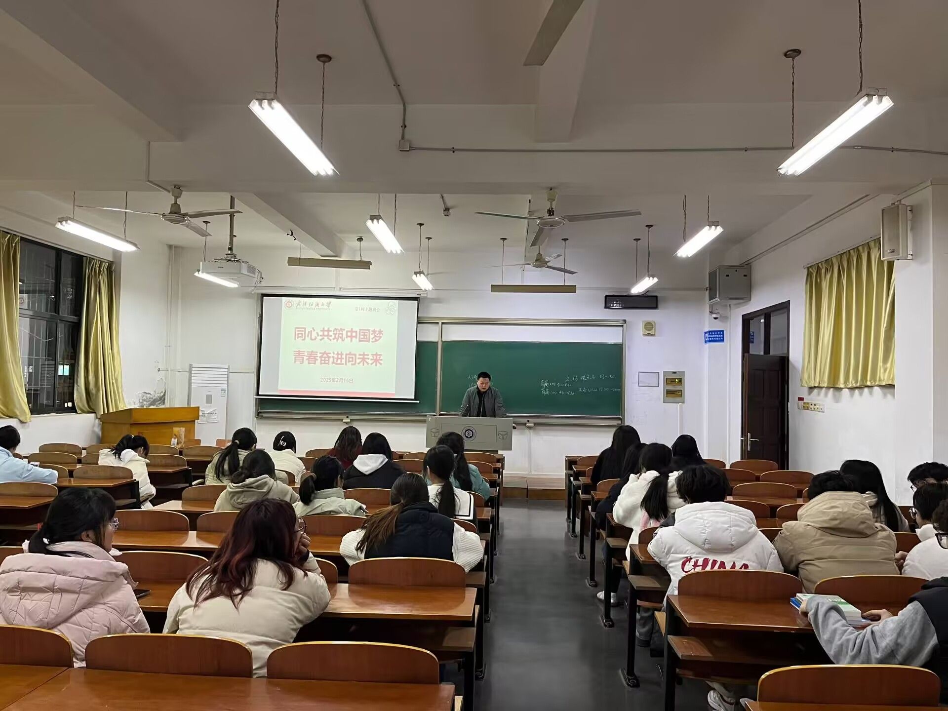 首先,各班老师带领学生回顾2025年新年贺词,提取关键信息与学生交流,并按时间顺序回看2024年大事。立足武汉纺织大学2024年十大新闻和2025年新年贺词,老师告诫学生团结奋斗、步履不停,用实干担当交出精彩的时代答卷。接着,老师向同学们介绍2025年国家规划和湖北“头等大事”,展示美好纺大“三步走”发展战略。