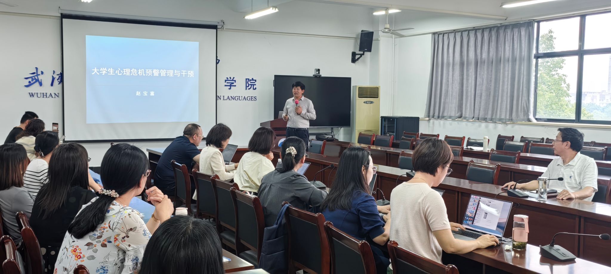 为进一步加强大学生心理健康教育工作,提升班主任、本科生导师在心理危机预警与干预管理方面的专业能力,5 月 15 日,外国语学院成功举办“大学生心理危机预警与干预管理”班主任、本科生导师心理健康工作坊。本次工作坊特邀校心理中心主任赵宝富担任主讲嘉宾,学院班子成员、全体辅导员、班主任、本科生导师参与活动,为筑牢学生心理健康防线提供专业支持。