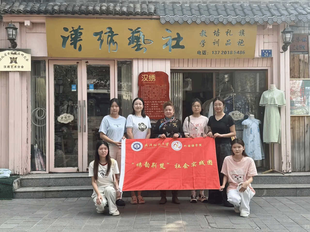 活动尾声,“绣韵荆楚”的实践团成员们在汉绣艺社门前合影留念,手中的旗帜与古色古香的艺社相映成趣。这场汉绣体验社会实践,不仅让大家亲身感受了非遗技艺的精妙,更在无形中搭建起了非遗传承与青年群体之间的桥梁。作为外国语学院的实践团成员,大家表示,会把在汉绣艺社的所见所学,通过社交媒体平台用外语讲述给更多国际友人,从汉绣的历史渊源,到针法技艺,再到这些精美的绣品背后的文化故事,让大家能更直观、深入地认识汉绣,让千年汉绣在年轻的指尖传承中,焕发出新的时代生机。