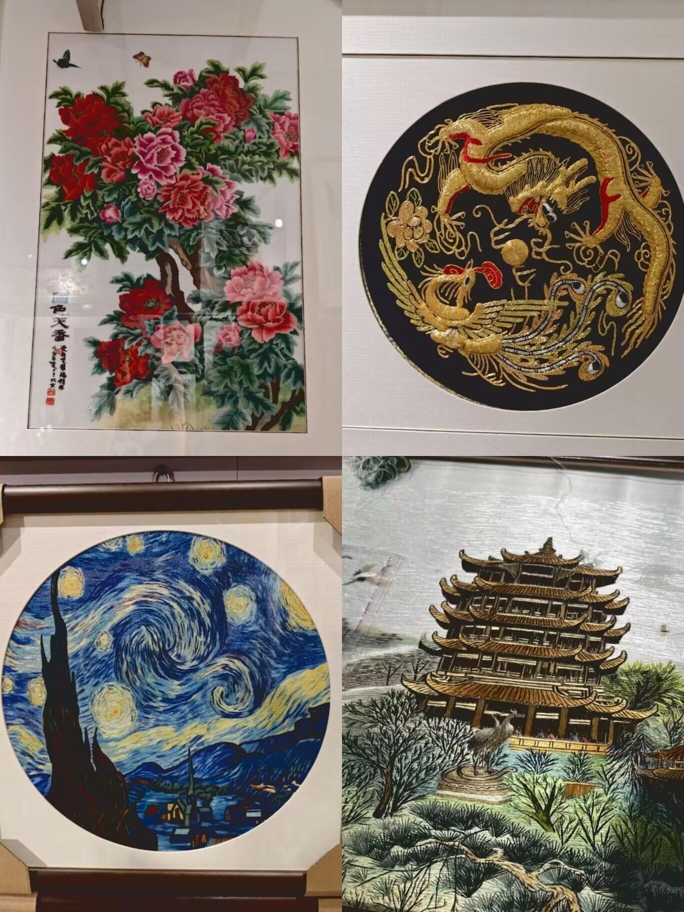 踏入汉绣艺社,成员们便被满室精美绣品吸引。有以黄鹤楼为主题的绣作,亭台楼阁、仙鹤绿树,在丝线勾勒下栩栩如生,尽显江城风光;还有《双凤戏牡丹》,金色凤凰姿态灵动,牡丹娇艳欲滴,华贵又充满生机;更有汉绣版《星月夜》,用丝线复刻出梵高笔下的璀璨星空,中西艺术在此奇妙融合;《国色天香》里的牡丹,色彩艳丽,层次丰富,将“花中之王”的雍容华贵展现得淋漓尽致。