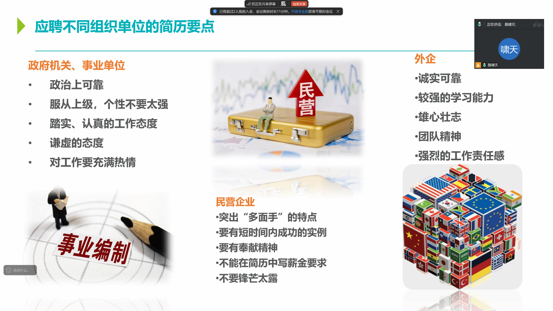 为切实提升毕业班学生的求职竞争力,帮助同学们在春招中脱颖而出,寒假期间,武汉纺织大学外国语学院毕业生辅导员通过线上平台,为毕业年级学生举办了一场主题为“简历制作与求职技巧”的就业指导会议。会议聚焦当前就业形势,从雇主视角出发,为学生提供了实用、深入的求职策略。