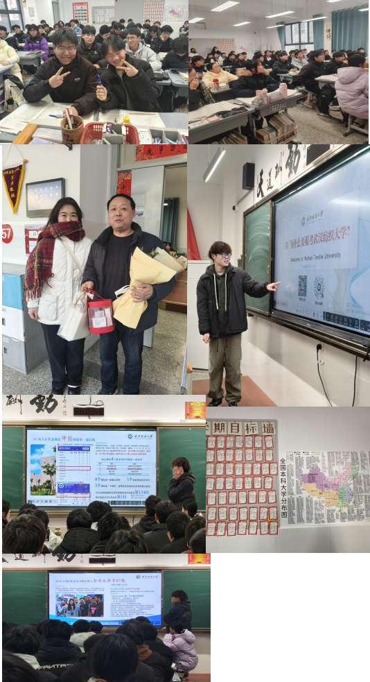 7.全面复盘与高考祝福:情系母校,期许未来活动结束后,团队对两场宣讲进行系统复盘,确保宣讲内容准确、互动充分、物料发放到位、联系渠道畅通。在活动尾声,团队成员向两校全体学子表达了诚挚的祝福与鼓励,寄语同学们坚守初心、科学备考, 并欢迎优秀学子未来报考武汉纺织大学,续写成长新篇章。