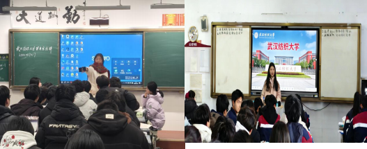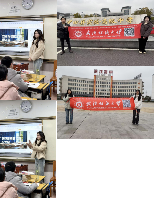 两场宣讲均以"从高中拼搏到纺大绽放"为主题,王思贝同学在罗田一中、江欣灿同学在罗田实高同步开展宣讲。通过精心制作的 PPT ,系统介绍了武汉纺织大学的办学特色、优势学科、校园环境及学生发展平台。宣讲重点展示了学校的社团文化、品牌校园活动、生活服务设施及人文氛围,运用生动图文和真实案例,帮助高中生直观了解纺大生活,激发报考兴趣。