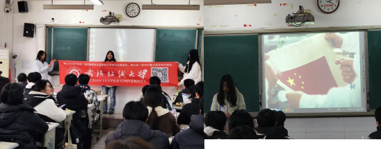 1.入校筹备与前期沟通团队成员提前与滨江高级中学的班主任老师取得联系,确认宣讲时间、场地及参与学生范围。当天抵达学校后,迅速布置宣讲会场,摆放武汉纺织大学的宣传册、文创周边,调试 PPT 与投影设备,确保活动顺利开场。