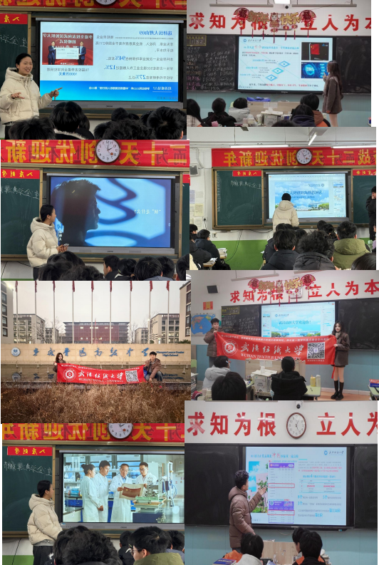1.入校筹备与前期沟通团队成员刘玉丽、王鸿燃提前与谷城一中的班主任及校团委老师取得联系,确认宣讲时间、场地及参与学生范围。当天抵达学校后,黄欣怡、刘伊凌迅速布置宣讲会场,摆放武汉纺织大学的宣传册、文创周边,刘晋阳、程金鸽则负责调试 PPT 与投影设备,确保活动顺利开场。
