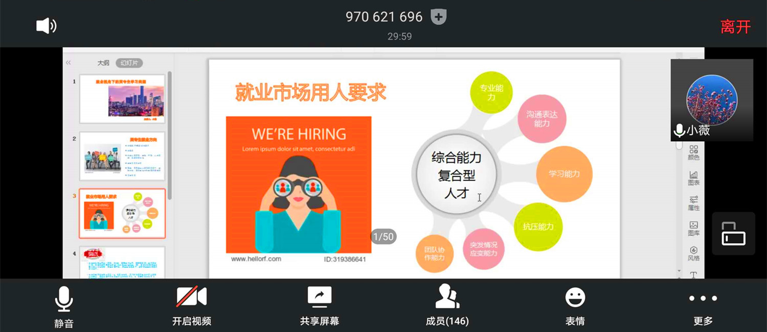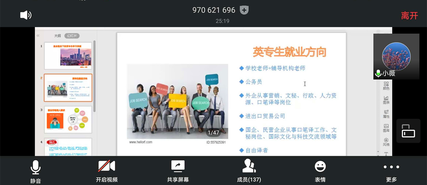 此次成长导航讲座,邹薇老师凭借其丰富的职场履历,分别从英专生就业方向、就业市场用人需求、英专生求职技巧等为切入点,与一同连线的英专学生们分享了自己在职场中不断成长积累的丰富经验。邹老师强调,英专生要不断扩大自己的外围知识,重视各专业领域的英文资料的收集和积累,多去图书馆,多参与社会实践,促进自身听说读写译各方面能力的齐头并进。邹老师鼓励英专生们学会分享学习和合作学习,以寝室为单位建立学习小组,分享交流,互相提高。