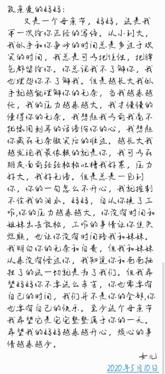 除了帮妈妈做家务之外,外院学生还以诗歌、书信的方式为自己的母亲献上自己的祝福。英语11701班学生谢淳特意为妈妈写了一首小诗以表达自己对妈妈的感激之情:“怀胎十月休言易,搓揉刷洗倍艰辛。阴雨风寒手抚额,受欺委屈怀中依。”短短几行诗,传达的却是对母亲长长的爱意。英语11801班的马玉粉则以书信的方式向母亲表达自己的无限感激之情。“未来的一天,我会用自己的钱,给你买花、买礼物。”她在给母亲的信中这样写道。信纸是没有温度的,而信纸所传达的感情是炽热的。