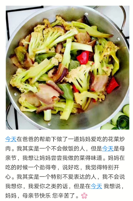 “人应有尽孝之念,莫等到欲尽孝而亲不在,终留下人生的一大遗憾。”对父母怀有感恩之心、懂得回报父母,是每个人需铭记在心的事情。英语11701班胡肖梦在母亲节这天承包了所有家务。让妈妈永远开心、年轻是她最大的一个心愿。