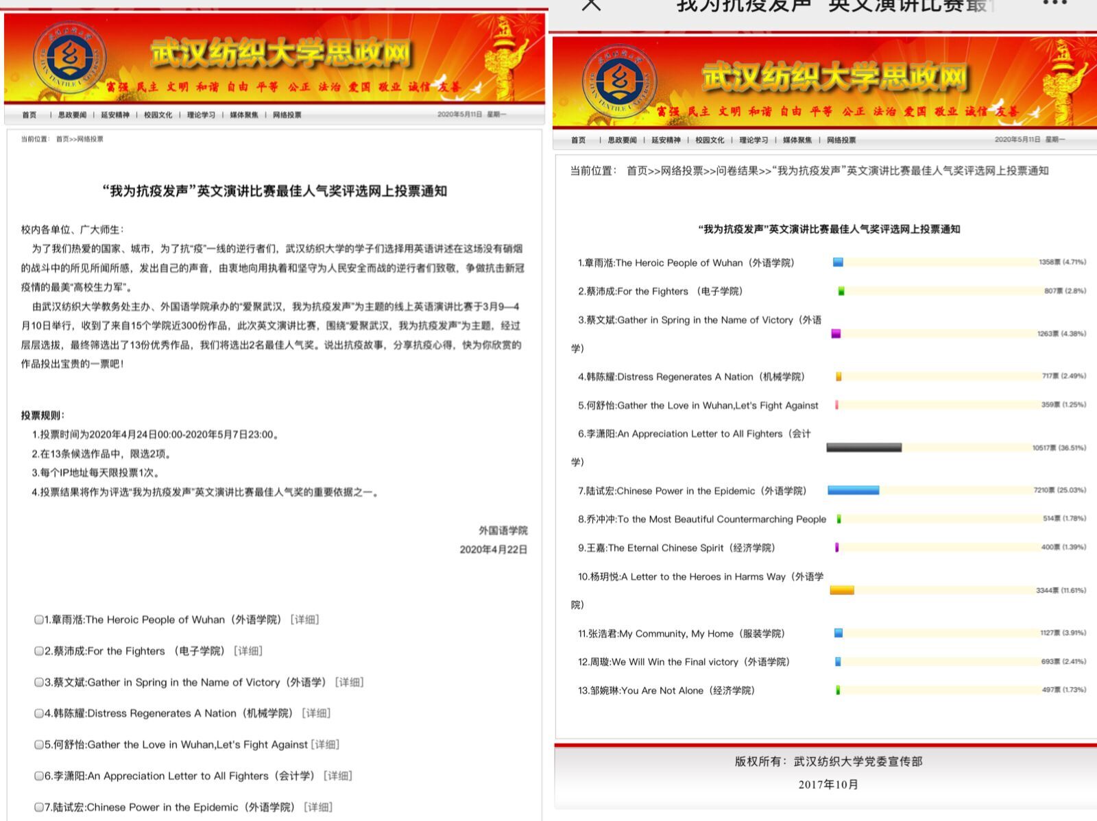 为了展现新时代大学生的家国情怀与责任担当,号召全校大学生向战“疫”英雄致敬,近期,由武汉纺织大学教务处主办、外国语学院承办的“爱聚武汉,我为抗疫发声”为主题的线上英语演讲比赛于线上举行。