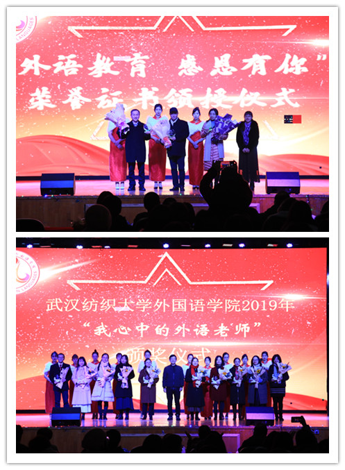 在闭幕式最后,还进行了武汉纺织大学“我心中的外语老师”颁奖和“外语教育 感恩有你”荣誉颁授仪式。经全校学生投票推选及各院班级的评审投票、外语学院教师投票推荐,结合学生评教入围全院排名前10%的标准,评选出2019年“我心中的外语老师”。校教务处处长何畏为华敏、关薇、陈宇兰、陈奇敏、杨雪、周文静、柯细香、唐娴、廖春燕、黎健等十名获奖老师颁奖,外国语学院院长谭燕保为胡才慧、刘辉、庄小华等三名老师颁授“外语教育,感恩有你”荣誉。