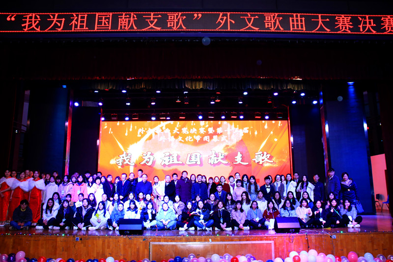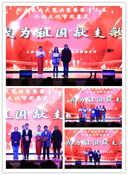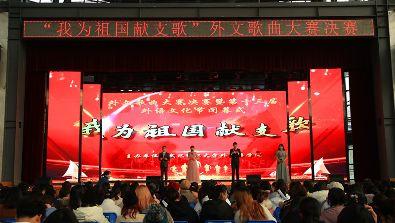 12月19日下午,武汉纺织大学“我为祖国献支歌”外文歌曲大赛决赛暨第十三届外语文化节闭幕式在阳光校区大学生活动中心演播厅如期举行。武汉纺织大学党委常委、副校长黄运平,教务处处长何畏,团委书记段薇静,学生工作部副部长李琼瑛,外国语学院院长谭燕保,外国语学院党委书记胡中原应邀出席。外国语学院全体教师以及八百余名在校生共享盛会,一同为祖国礼赞。第十三届外语文化节还收到了来自外院领导、教师,国际友人,兄弟学院、各级学生组织、学校后勤人员的祝福。