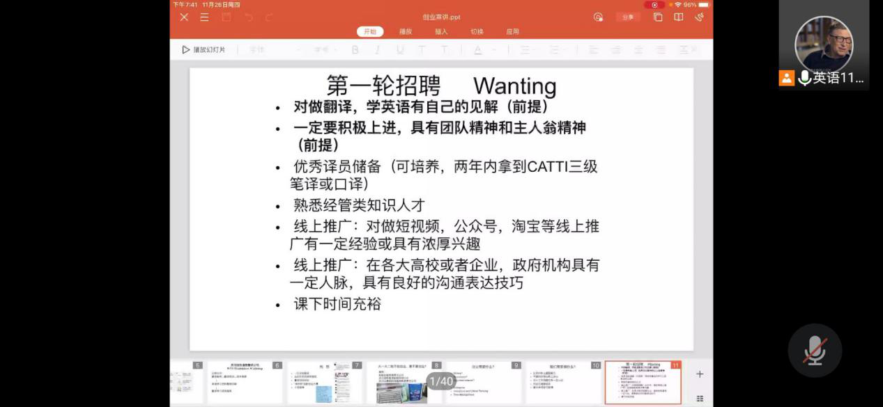 11月26日晚上七点,秉承当今社会积极发扬创新精神的理念,外国语学院于线上开展“创业经验分享会”,19级优秀学子蔡文斌给怀揣梦想的大一新生分享了他的创业构想与创业经历,号召大家“积极创业,敢于创业”。