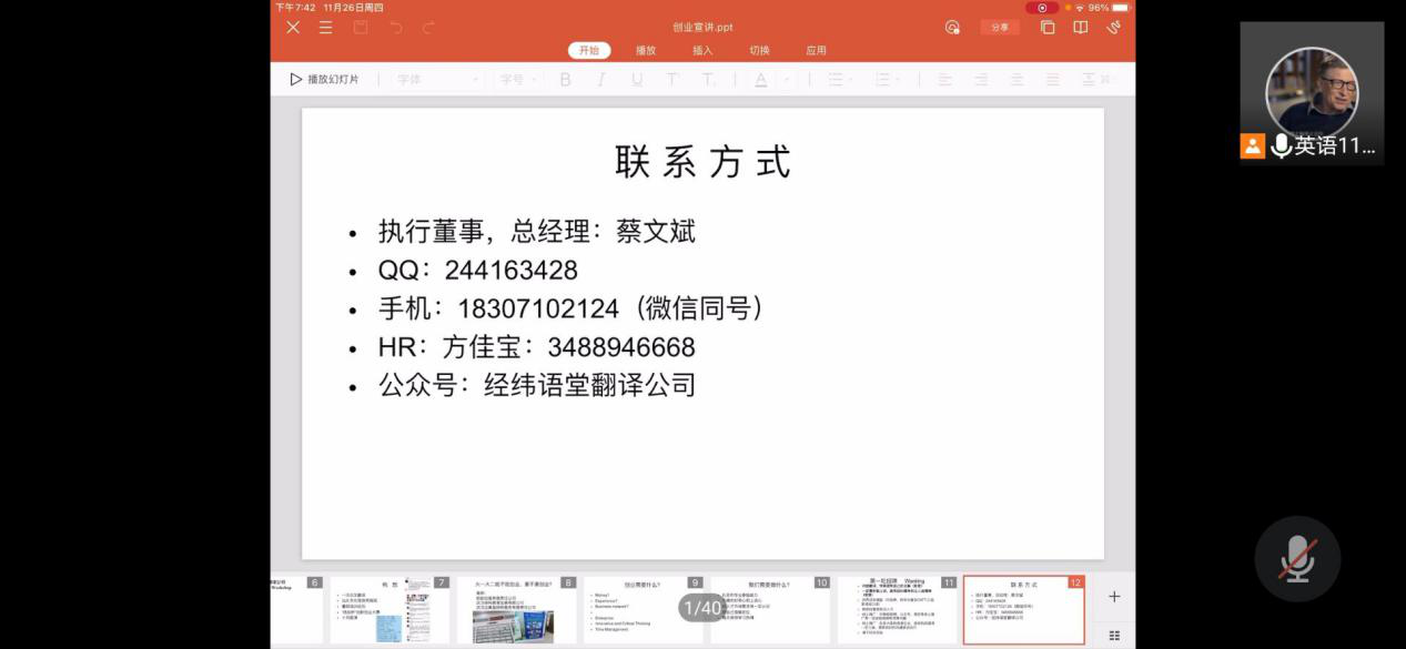 作为“武汉经纬语堂翻译公司”的执行董事,蔡文斌学长的创业精神与创业成功的经历给予新生鼓励,以自己成功的果实给新生树立起学习榜样。“创你所爱,业终成实”。首先,只要有自己热爱的东西,有好的想法,有好的创业思路,均可以投入精力加以实施,年纪不足以构成创业的瓶颈。其次,创业经费是必要,但不是首要,“国家大学生创业补贴”等项目将会为其提供相关的帮助。创业最重要是拥有上进心与批判性思维,在自己所热爱的事业上,在不影响学习的基础上,努力奋斗实现自己的创业梦想,铺就创业之路。