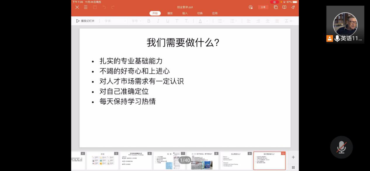 随着市场经济的不断开放与壮大,大学生也应紧随时代大流,把握机遇。创业最大的好处在于可以提高自己的能力、增加经验、以及提升社会责任感,这有利于提高综合素质和促进个人全面发展。诚然,拥有敢于创新的勇气、持之以恒的决心、敏锐慧智的洞察力是作为创业者所需的基本素质。“纸上得来终觉浅,绝知此事要躬行”。本次线上会议,给同学们未来的创业道路燃起了一盏明灯。相信在这个不断探索的过程中,同学们可以真正发挥个人才华,在展现创新思想的同时把握时代脉搏,充分认识社会需求,早日实现自己的创业梦想,成就自己的不凡人生。