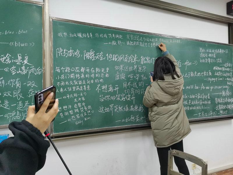 商英12001班在心理委员的组织下开展了以“治愈歌曲分享会”为主题的活动。通过分组比赛的方式让每组同学分享能让自己愉悦的音乐,并由分享歌曲的同学说出歌名在黑板上写下自己最喜欢的几句歌词并标上歌名,同学们通过这次音乐分享会也变得更加活跃自信。