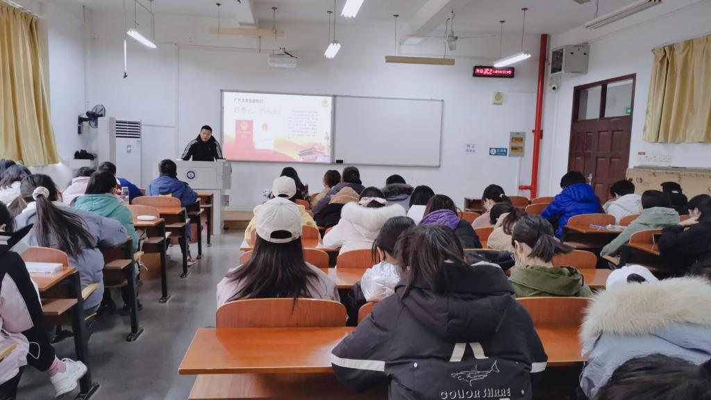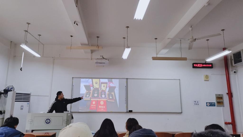 12月18日下午,外国语学院在崇志楼102教室组织征兵入伍宣传,学院辅导员聂啸天进行授课和政策宣讲。