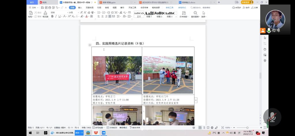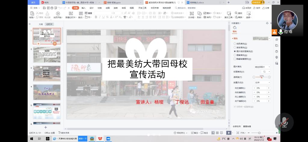 为帮助学院参与寒假实践活动的学生积极组织开展活动,让每一位参与实践的学生更快地提升自身实践水平,1月12日晚上,外国语学院举办了“把美好纺大带回母校”活动经验分享线上会议,本次活动由学院2018级学生、曾获得过第三届“把美好纺大带回母校”实践活动一等奖的团队队长杨璨主持,并为本次参赛队伍成员分享活动经验。
