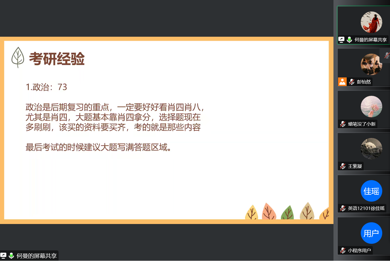 为了给考研的同学们分享一些学习方法,帮助考生在考前调整心态,外国语学院于2022年11月6日晚在线上开展了朋辈领航分享会,全院100多名学生积极参与分享会。
