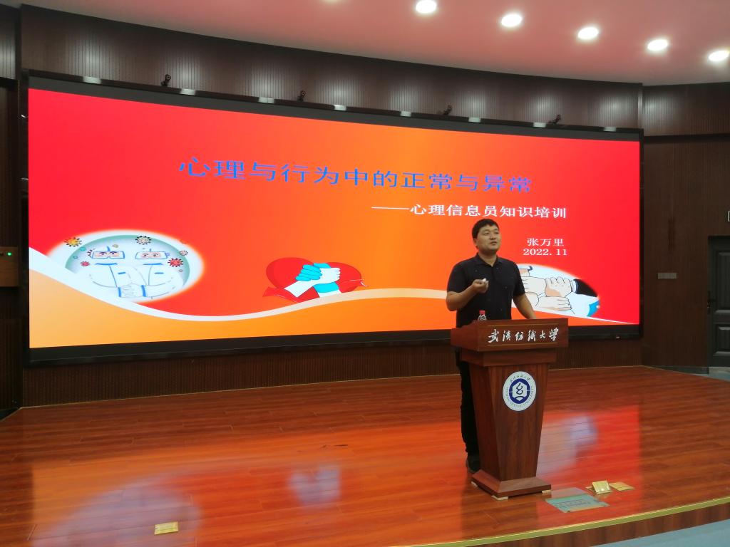 为进一步优化开展学院心理健康教育工作,增强心理信息员队伍的能力,完善学院心理健康工作网络格局,更好服务学生的成学成才。11月11日10点,外国语学院在崇志楼T201教室开展“心理与行为中的正常与异常”心理信息员知识培训会,此次培训会由学校心理咨询老师张万里主讲,学院党委副书记彭阳慈航辅导员甘新敏以及全体心理健康信息员参加了培训会。