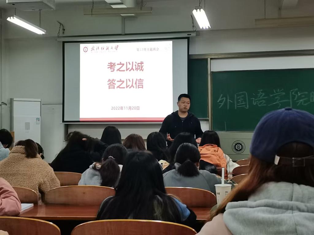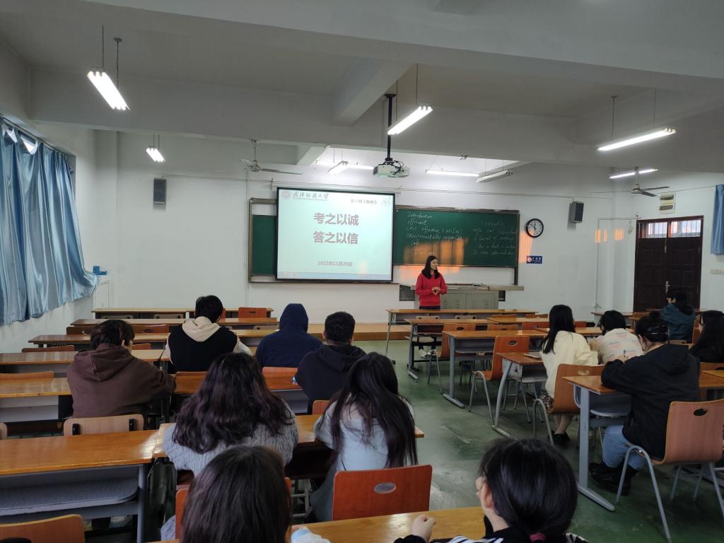 为了全面贯彻落实学校有关考试的要求,进一步严肃考风考纪、净化考试环境,形成良好的诚信之风,培养学生的诚信品德,营造公平、公正、诚信的考试氛围,12月20日,外国语学院辅导员聂啸天、甘新敏在全院范围内组织开展了“诚信教育”年级大会,同学们积极参与并签署了诚信考试倡议书。