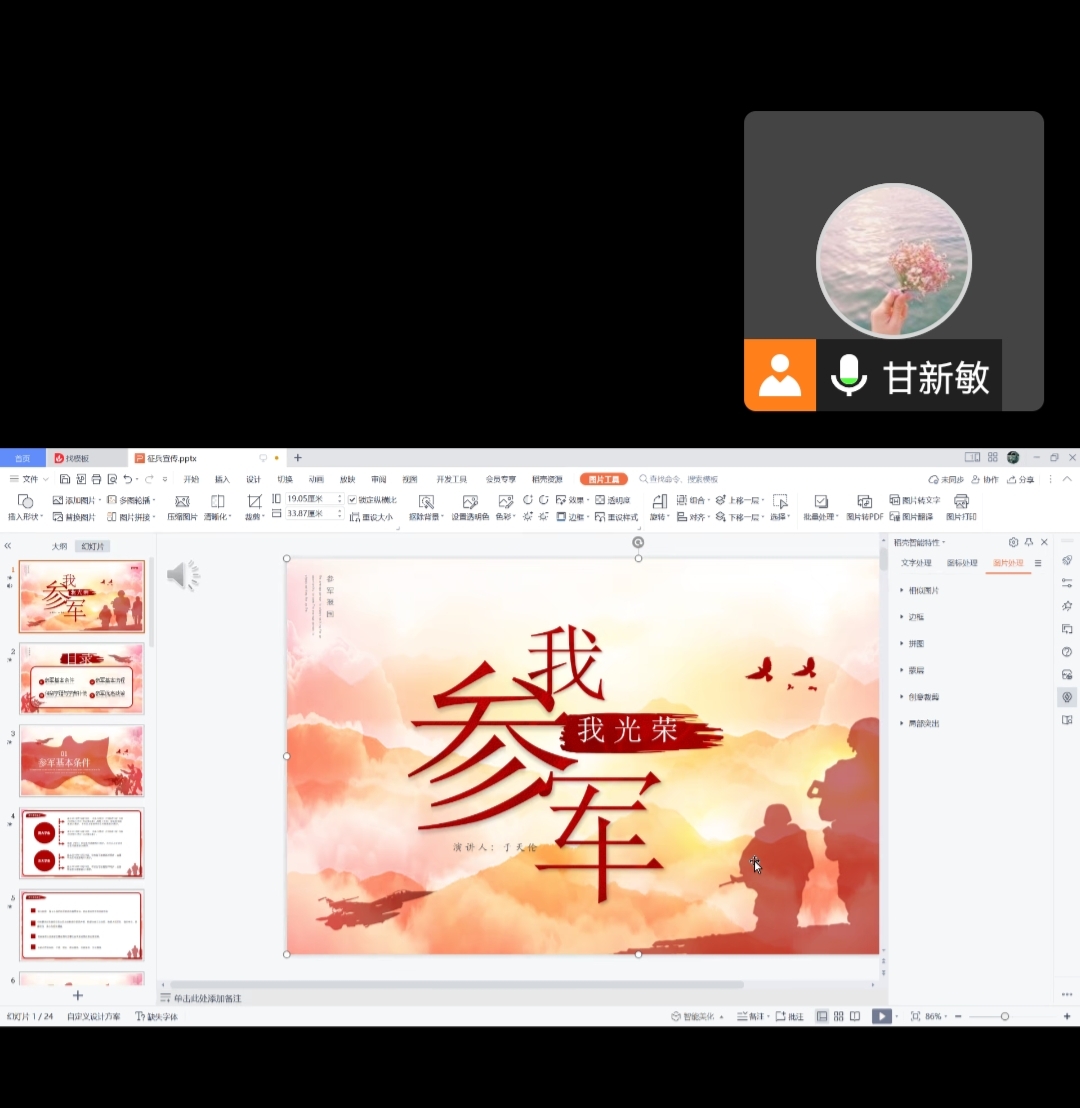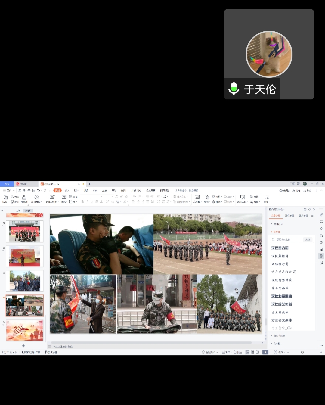 为进一步让同学们了解大学生征兵入伍的政策,鼓励学生积极应征入伍,多经历、多锻炼,11月27日18:00,外国语学院于腾讯会议召开了征兵入伍宣传朋辈领航,本次朋辈领航邀请了2018年退伍大学生于天伦主讲,辅导员甘新敏主持会议,全体同学参与此次会议。