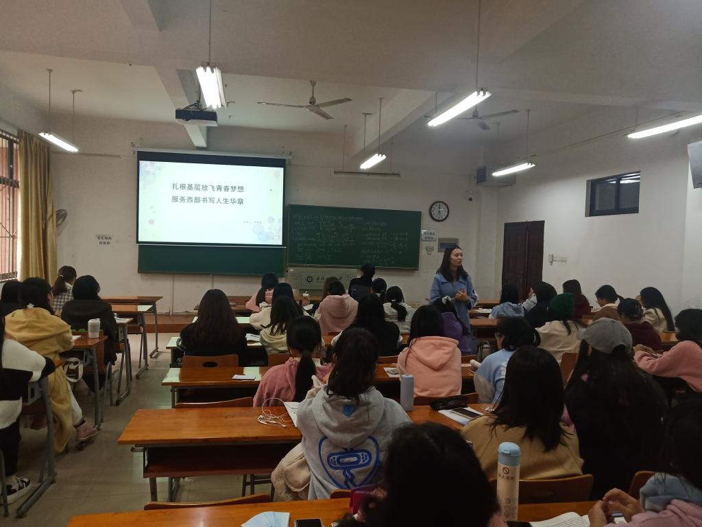 甘老师首先向我们介绍了“选调生”这一我们从来没听过的名词。老师首先介绍了选调生和大学生村官、三支一扶的区别,其次列出了成为选调生需要有哪些条件。许多同学对这一陌生的词感到好奇,对老师的介绍也听得很仔细。老师告诉我们,大学的路并不是只有工作、考公考研这几条路可以走,而是充满着机会和选择,她向我们介绍的选调生,便是一条可行的路。老师的介绍印证了,大学确实是充满了可能性的地方,而作为刚刚入校的我们,则应该时刻清楚这一点,为自己的人生做好规划,努力地提升自己。