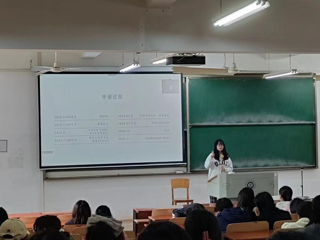 首先胡梦君从是否选择留学和如何根据自身情况择校做出了系统介绍,接着胡梦君以自身经历通过图片视频等多种形式给同学们了一些申请过程中的要点,帮助有意向留学的同学提前避坑。同时胡梦君也对根据不同年级对有意向留学的学弟学妹们提出了针对性的建议,以便大家尽早做好充足的准备。