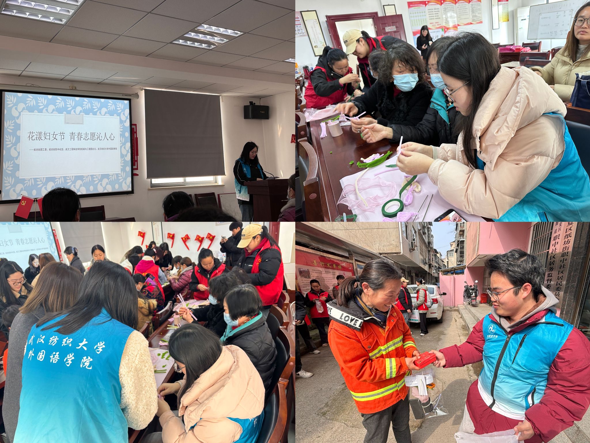 在第104 个国际劳动妇女节来临之际,为了更好走进社区,庆祝妇女节的到来,2024年3月7日上午,外国语学院志愿者前往江夏区职中社区党员群众服务中心开展了以“花漾妇女节 青春志愿沁人心”为主题的妇女节庆祝活动,参与此次活动的还有职中社区工作人员、居民代表以及武汉工程科技学院的志愿者们。